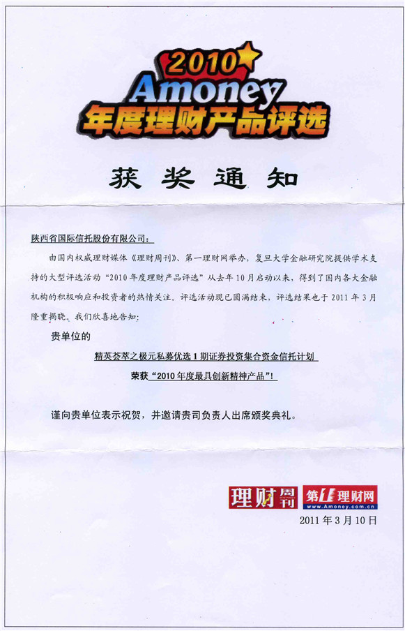 由《理財(cái)周刊》、《第一理財(cái)網(wǎng)》主辦,于2010年10月正式啟動(dòng)的2010年度理財(cái)產(chǎn)品評(píng)選揭曉。在銀行、基金、信托、保險(xiǎn)行業(yè)2010年度推出的理財(cái)產(chǎn)品中共評(píng)選出了《年度最受關(guān)注產(chǎn)品》、《年度最具創(chuàng)新精神產(chǎn)品》、《年度最具競(jìng)爭(zhēng)力產(chǎn)品》等獎(jiǎng)項(xiàng)。我公司發(fā)行的“陜國(guó)投·精英薈萃之極元私募優(yōu)選1期信托計(jì)劃”榮獲《年度最具創(chuàng)新精神產(chǎn)品》獎(jiǎng)。