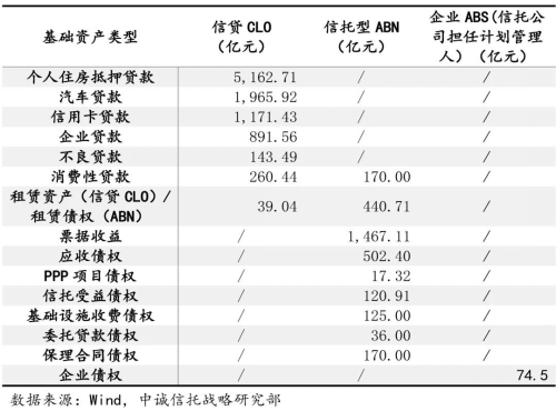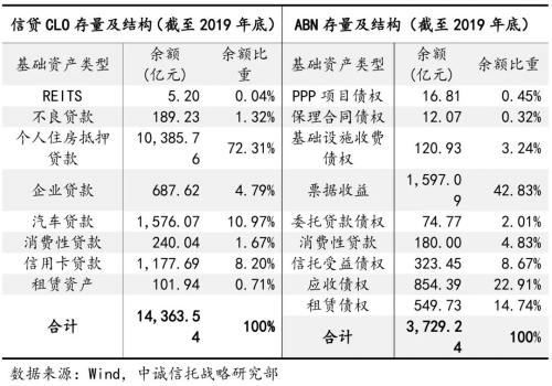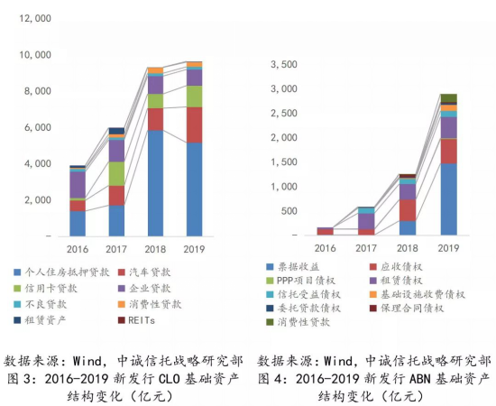 信托參與的存量資產證券化業(yè)務中,基礎資產結構與新發(fā)行情況相似。根據(jù)2019年底的存量數(shù)據(jù),存量信貸CLO中,個人房貸、車貸、信用卡貸占比居于前三,個人房貸占比超過七成,三類基礎資產合計占比超過九成;存量ABN中,票據(jù)收益、應收債權、租賃債權占比居于前三,三類基礎資產合計占比超過八成。