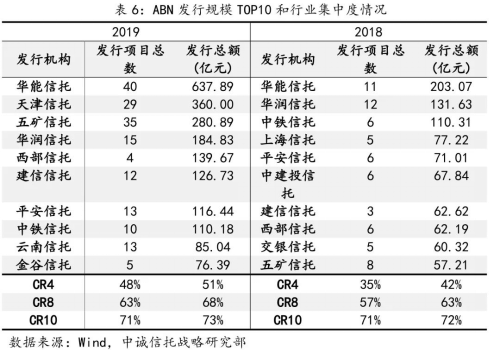 二是信貸CLO行業(yè)集中度有所下降,ABN行業(yè)集中度進一步提高,信托公司擔任計劃管理人的企業(yè)ABS則僅有華能信托一家信托公司有項目落地。信貸CLO行業(yè)集中度下降與更多信托公司參與但市場規(guī)模持平有關,ABN行業(yè)集中度提高與部分信托公司展業(yè)力度大、規(guī)模高速增長有關。從企業(yè)ABS一級市場來看,2019年共97家計劃管理人參與,華能信托發(fā)行規(guī)模排名30,行業(yè)排名較上年大幅提升。