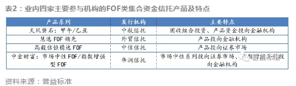 資源整合能力強(qiáng)。以往信托公司主導(dǎo)的TOT模式下,在資金端信托公司與銀行聯(lián)系緊密,而在投資端則與證券公司、私募基金公司等投顧機(jī)構(gòu)有長(zhǎng)期合作關(guān)系,信托公司在FOF業(yè)務(wù)模式下能夠繼續(xù)整合、使用積累的資源,提供高效服務(wù)。