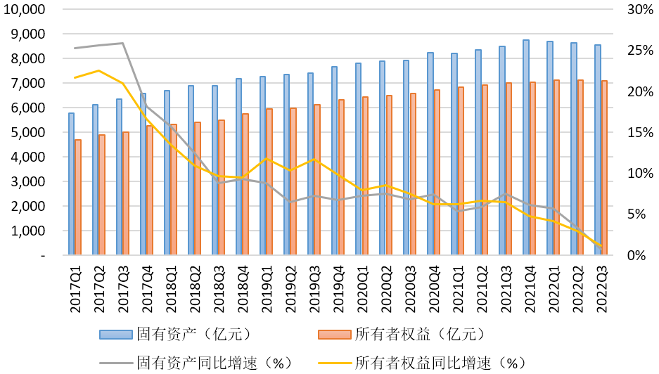 一是行業(yè)資本實力保持穩(wěn)定。從固有資產(chǎn)總額來看,3季度末達到了8562.88億元,同比略增59.32億元,增幅0.70%;環(huán)比略有下降0.89%。從所有者權(quán)益總額來看,2022年3季度末達到了7087.25億元,同比增長81.18億元,增幅1.16%,環(huán)比下降0.56%。行業(yè)固有資產(chǎn)總額、所有者權(quán)益總額自2010年以來持續(xù)保持正增長,但從2021年3季度開始季度增速明顯回落,2022年3季度則進一步收窄,且環(huán)比數(shù)據(jù)出現(xiàn)下滑,這也反映出當前行業(yè)發(fā)展轉(zhuǎn)型過程中出現(xiàn)盈利能力下降導(dǎo)致資本積累減少、投資吸引力減弱導(dǎo)致增資活躍度降低等挑戰(zhàn)。