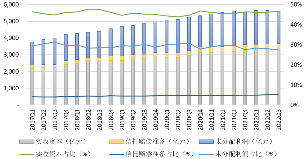 二是所有者權(quán)益內(nèi)部結(jié)構(gòu)基本保持穩(wěn)定。實收資本一直是所有者權(quán)益中最主要組成部分,截至2022年3季度末,全行業(yè)實收資本為3299.79億元,同比增長112.58億元,增幅3.53%,環(huán)比增長0.46%,在所有者權(quán)益中的占比達到了46.56%,同比提升1.07個百分點。3季度末未分配利潤達到1943.39億元,同比下降138.87億元,降幅6.67%,環(huán)比下降2.35%,與部分機構(gòu)通過未分配利潤轉(zhuǎn)增資本和現(xiàn)金分紅有關(guān),在所有者權(quán)益中占比27.42%,同比降低2.3個百分點。信托賠償準備保持較快增長,3季度末規(guī)模為355.35億元,同比增長25.69億元,增幅7.79%,環(huán)比略降2.32%,在所有者權(quán)益中占比為5.01%,同比上升了0.31個百分點。