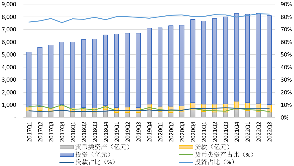 三是固有資產(chǎn)中投資運用方式進一步占據(jù)主導(dǎo)。2022年3季度末固有資產(chǎn)通過投資方式運用的規(guī)模達到7041.78億元,同比增長108.76億元,增幅1.57%,環(huán)比降低1.06%,占比達到82.24%,同比進一步提升0.71個百分點,且2022年連續(xù)3個季度的占比均保持在80%以上。貸款方式運作的規(guī)模為628.73億元,同比下降22.58億元,降幅3.47%,環(huán)比下降1.27%,占比為7.34%,同比略降0.32個百分點,相對占比自2018年2季度跌至谷底以后總體保持小幅回升態(tài)勢。貨幣類資產(chǎn)規(guī)模為412.53億元,同比下降2.88%,環(huán)比下降16.40%,占比4.82%,同比略降0.18個百分點,占比總體呈現(xiàn)持續(xù)下降態(tài)勢。