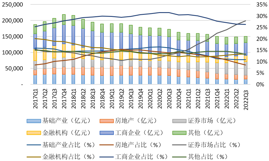 1.投向證券市場、金融機構(gòu)的規(guī)模和占比持續(xù)提升。截至2022年3季度末,投向證券市場的資金信托規(guī)模為4.18萬億元,同比增長1.12萬億元,增幅36.80%,環(huán)比增長7.40%;較2021年末規(guī)模增長24.59%;占比提高到27.85%,同比上升8.35個百分點,環(huán)比上升1.64個百分點。當前社會理財資金配置由非標類資產(chǎn)向標準化資產(chǎn)轉(zhuǎn)移的趨勢明顯,信托業(yè)在證券投資領(lǐng)域與基金、券商、銀行理財?shù)荣Y管同業(yè)相比,仍然規(guī)模較小,參與深度有限,但加快做強做優(yōu)做大證券市場類信托業(yè)務(wù)已基本成為行業(yè)轉(zhuǎn)型共識。二是投向金融機構(gòu)的資金信托規(guī)模為2萬億元,同比增長0.10萬億元,增幅5.32%,環(huán)比增長2.40%;較2021年末規(guī)模增長7.14%;占比上升至13.32%,同比上升1.21個百分點,環(huán)比上升0.17個百分點。
